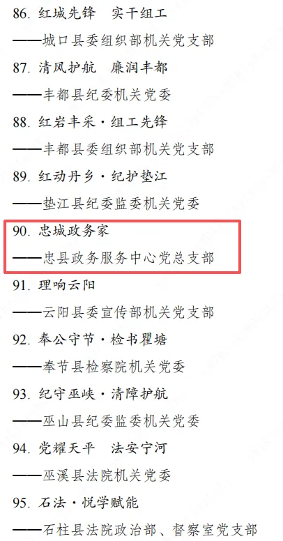 近日,市委直属机关工委通报了全市机关党建品牌评选情况,忠县4个品牌上榜,分别是: