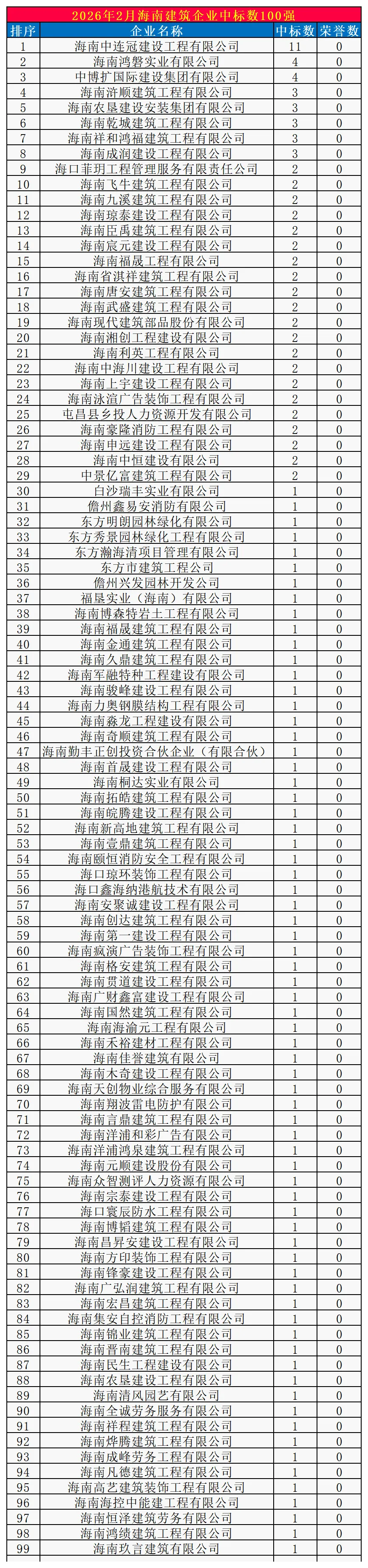 来源:CBI建筑网,数据统计时间段:2026年2月1日-2月28日CBI建筑网综合报道:在2026年2月,海南省建筑施工企业中标数量达589,环比(与上个月相比)下降29.96%,同比(与去年同期)上升29.74%。其中,海南中连冠建设工程有限公司、海南鸿磐实业有限公司、中博扩国际建设集团有限公司分列海南省建筑施工企业中标数量排行榜前三位。来源--建设通 PS:本次数据统计来源于全国各省市建筑交易中心类网站所发布的中标通知书,信息来源真实、有效。但由于少部分建筑交易中心未被发现,或少量工程项目要求联合体投标被重复统计,可能导致本次统计数据出现一定误差。