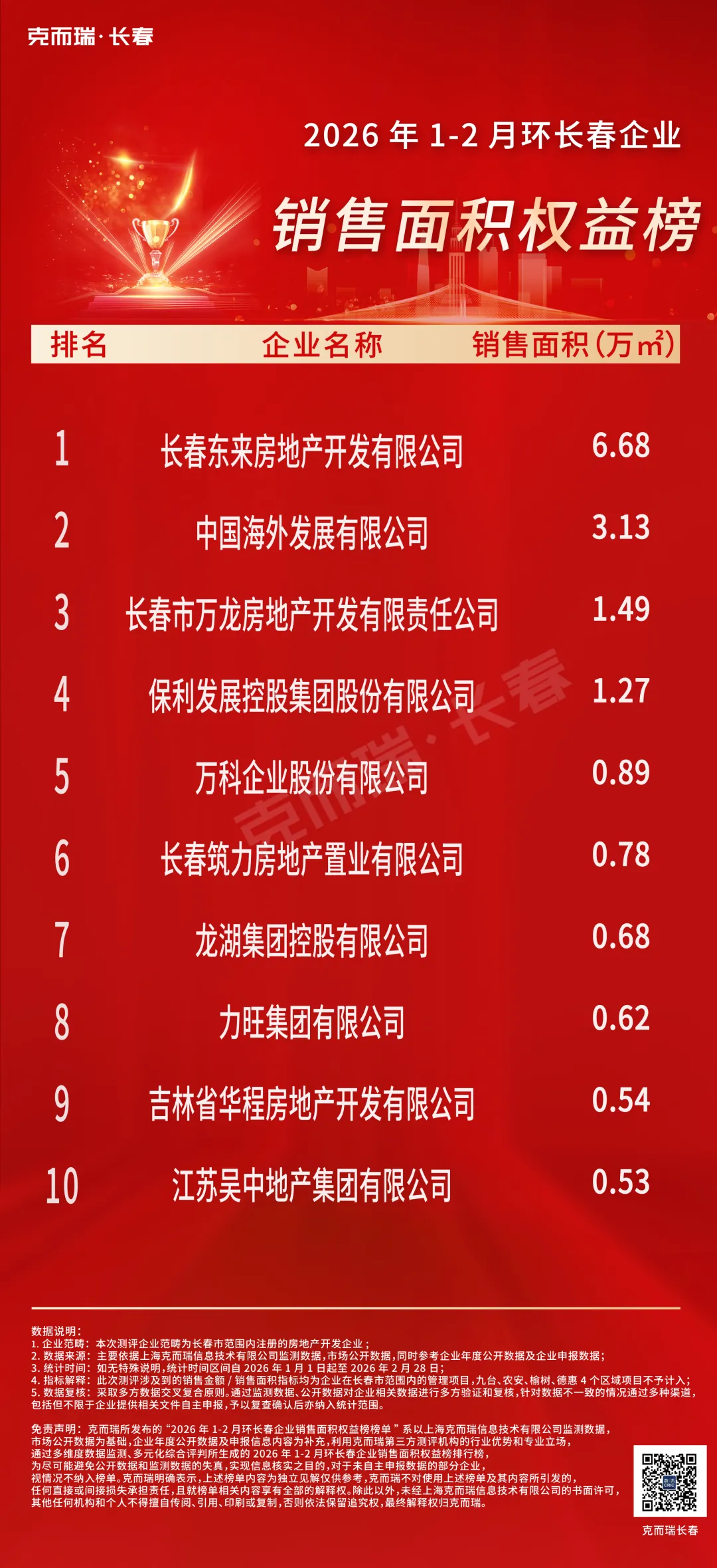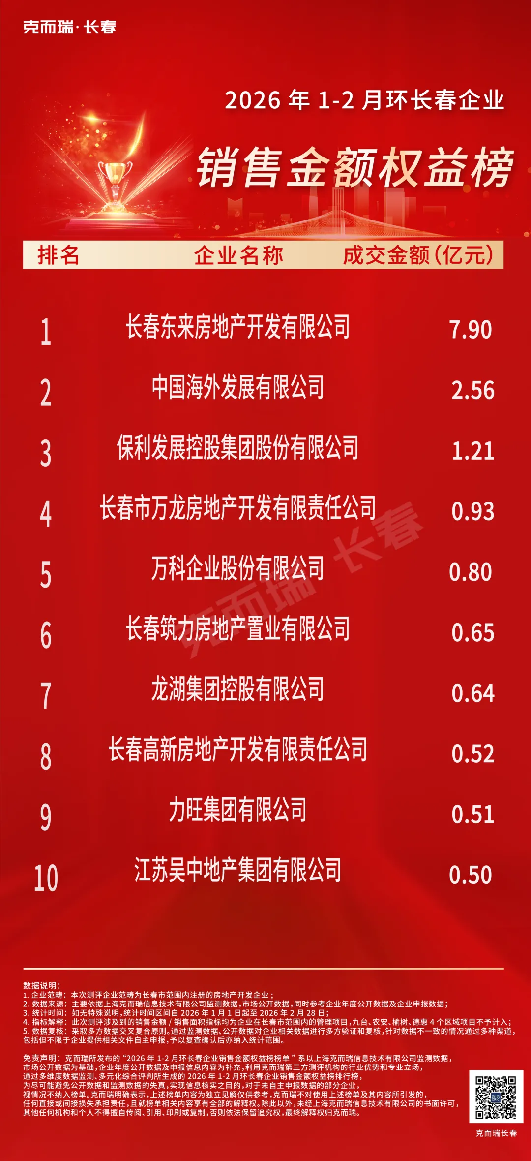 克而瑞所发布的“2026年1-2月环长春企业销售榜(权益)榜单”系以上海克而瑞信息技术有限公司监测数据,市场公开数据为基础,企业年度公开数据及申报信息内容为补充,利用克而瑞第三方测评机构的行业优势和专业立场,通过多维度数据监测、多元化综合评判所生成的2026年1-2月环长春企业销售榜(权益)排行榜,为尽可能避免公开数据和监测数据的失真,实现信息核实之目的,对于未自主申报数据的部分企业,视情况不纳入榜单。克而瑞明确表示,上述榜单内容为独立见解仅供参考,克而瑞不对使用上述榜单及其内容所引发的任何直接或间接损失承担责任,且就榜单相关内容享有全部的解释权。