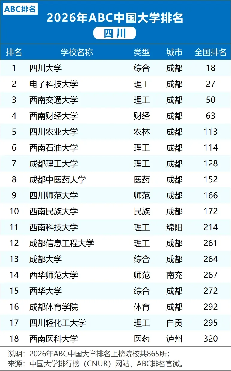 根据CNUR网站提供的ABC中国大学排行榜,我特意把四川省高校的排名部分抽了出来,整理得明明白白——不管是本地考生想留在家门口读好大学,还是外地考生想捡漏高性价比985、211,这篇都能帮你少走弯路,纯干货无废话,建议收藏备用!先给大家来个宏观暴击:2026年四川高校真的太给力了!一共有4所闯进全国100强,10所闯进全国200强,综合质量在全国高校里排第8,放在西部省份里,实力绝对能打!接下来,咱们按梯队拆解,从TOP1到潜力黑马,每所学校的优势、王牌专业、就业走向全扒透,看完再也不用纠结择校!第一梯队:双985领跑,川大+电科,风格截然不同