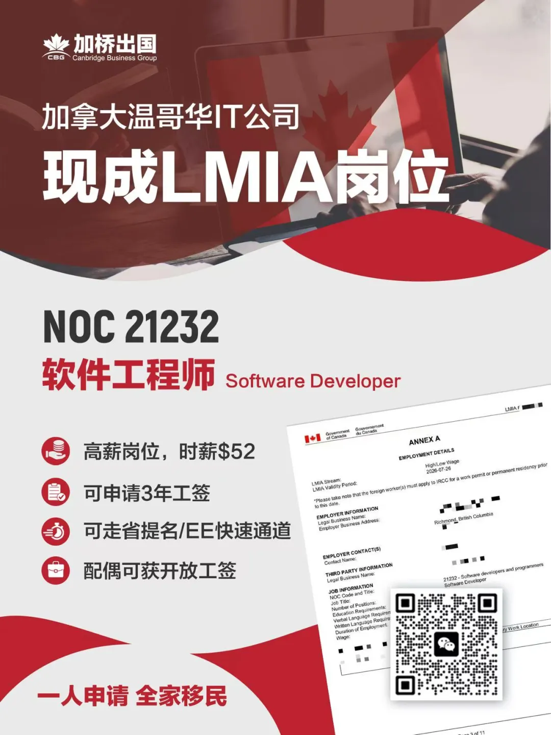 🇨🇦 温哥华 IT 软件工程师岗位|现成 LMIA,时薪 $52,3 年工签,紧缺职业可走 EE / 省提名快速通道;配偶 开放工签,子女 免费公立教育,真正实现 全家一步到位移民加拿大 🚀💼👨👩👧