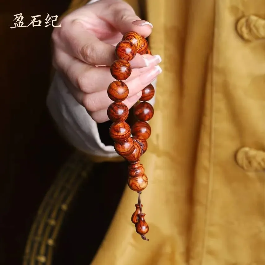 2. 产品特性:盈石纪黄花梨坚守天然本真的核心原则,坚决杜绝人工染色、喷香、注胶等任何优化处理手段,最大程度保留海南黄花梨的原生纹理、天然香韵与木质特质,从源头杜绝冒充品与假料,让每一串手串都呈现最纯粹的天然质感。