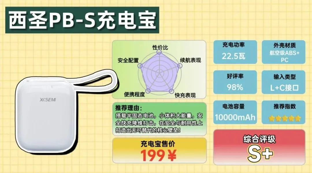 百元内想入手一款安全、耐用、性能强的充电宝?那一定不能错过西圣PB-S半固态充电宝!西圣在充电安全规范上的标准远高于行业常规,对电芯稳定性、温控精度和异常风险的控制都做到了极其严苛的级别,这一点对日常随身携带、长期使用来说非常重要。在多项专业测试中,PB-S多项关键指标均大幅领先同价位产品,其中输出稳定性提升116%、充电速度提升44%、电池循环寿命提升51%,并通过长期性能稳定测试,意味着用上好几年,充电表现依然可靠,在高功率输出的同时,将对手机和电池的潜在损害降低高达96%,这也是它被称为“安全快充”性能之王的底气所在。