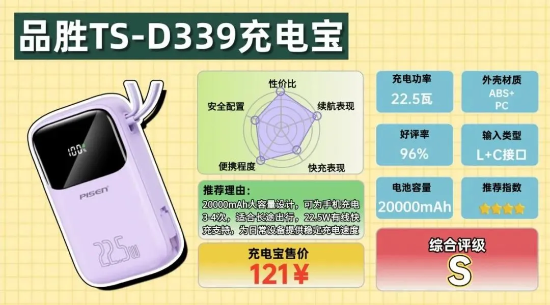 品胜这款 TS-D339 属于比较常见的大容量款,电池容量达到 20000mAh,额定容量在同类产品中也算正常水平。实际使用时,如果是给主流手机充电,大致可以补充三到四次电量,对于需要长时间外出的人来说还是比较安心的,比如出差、旅行或者一整天在外办公时,基本不用担心手机突然没电。