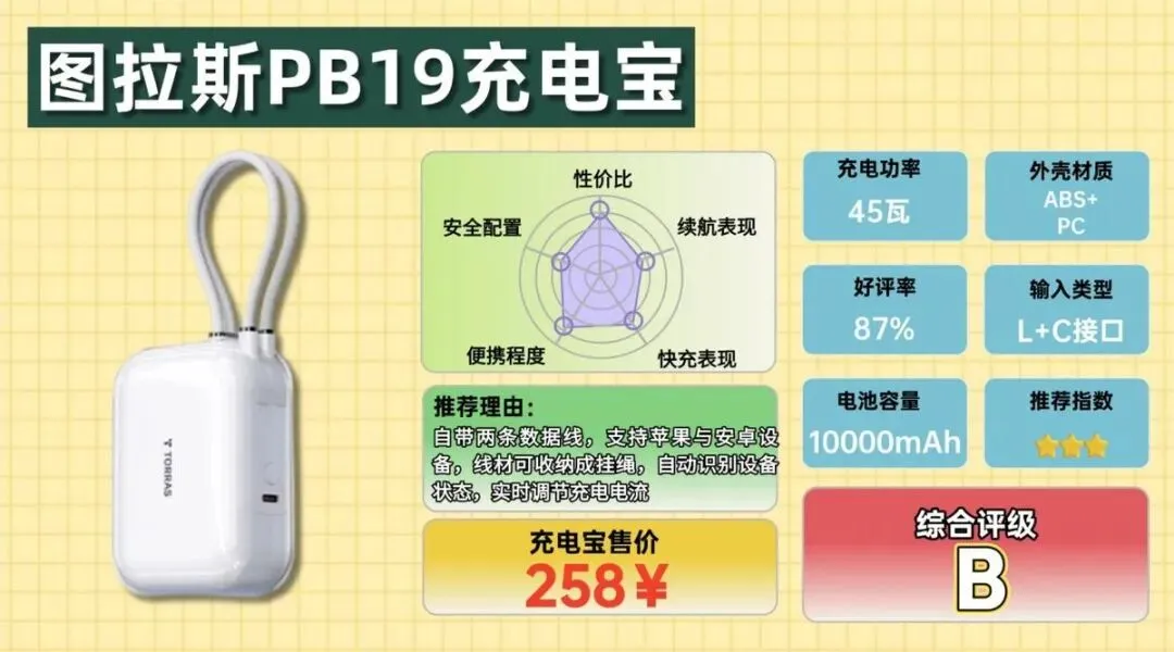 图拉斯 PB19 的设计比较有特点,它在机身上直接做了两条自带充电线,一条支持苹果接口,一条支持Type-C。平时收纳时可以当作挂绳使用,出门时直接拎着也比较方便,不用再单独准备数据线。