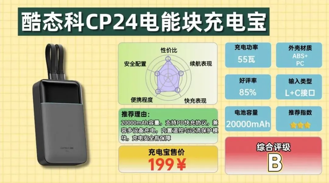酷态科 CP24 属于比较典型的大容量移动电源,电池容量达到20000mAh,额定容量约12000mAh。实际使用中给手机补电三到四次比较常见,对于长途出差或者户外使用来说会更安心一些。