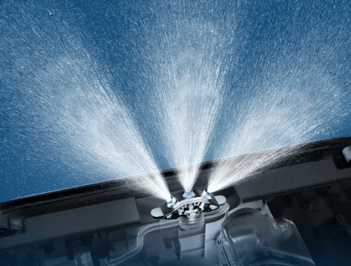 同时,在清洁力方面,火鲸H7S采用双向六喷头设计,喷头形成的高密度水雾矩阵,能瞬间将超细纤维布充分浸湿。在湿润状态下,布料紧密收缩贴合玻璃表面,不仅擦拭阻力小,让机器运行更顺畅,更实现了不伤玻璃且高效去污。