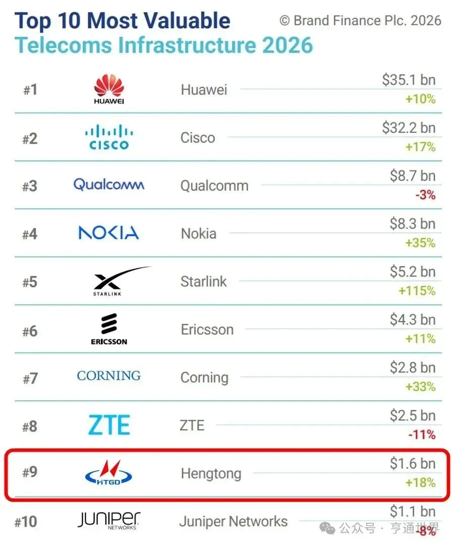 近日,英国知名品牌评估机构“品牌金融”(Brand Finance)发布了2026年“全球通信基础设施品牌价值10强”榜单(Telecoms Infrastructure Brands 2026)。亨通光电上榜,位列全球第九位。