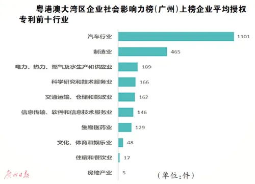 入围榜单的100家企业共分布在16个行业,专利总数为18964件。其中汽车行业平均专利数最多,达1101件;其次是制造业,平均专利数465件;电力、热力、燃气及水生产和供应业排第三,平均专利数189件。本文来源:广州日报