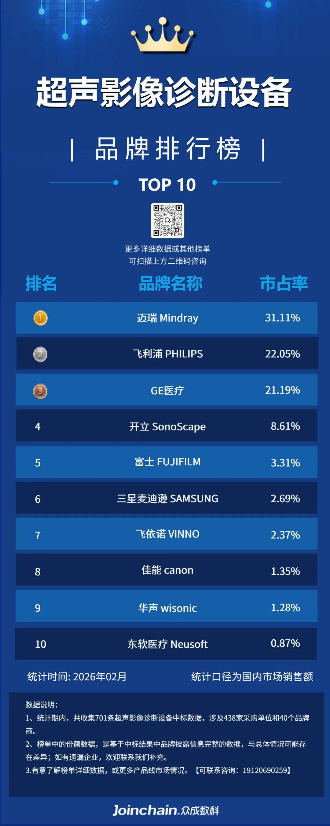 据众成数科医械云标讯MDBIDS统计分析,2026年2月中国超声影像诊断设备排名前三的品牌为迈瑞(31.11%)、飞利浦(22.05%)、GE医疗(21.19%)。