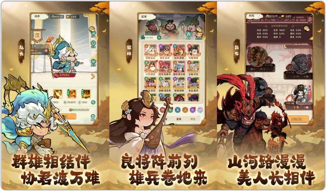 小五碎碎念:三国题材的多回合策略小游戏,泡澡读书养武将,区别于传统三国游戏的高强度肝度,玩法更偏向轻松放置。可搭配不同阵营武将激活羁绊,站位调整也有讲究。首抽必得SSR龙将,无废卡设计,各品阶武将都能进阶,我自己玩下来,我觉得节奏略慢于其他的三国,适合喜欢三国题材、想玩策略游戏又不想费肝,然后想要慢慢玩的玩家。