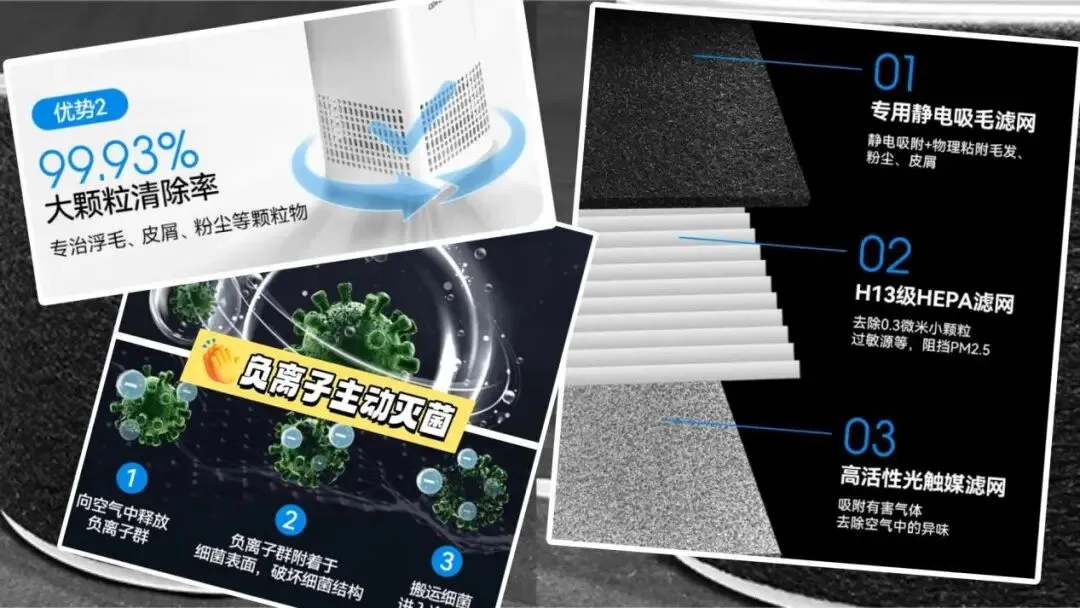 核心技术:产品核心聚焦养宠家庭空气净化刚需,搭载HEPA滤网与紫外线双重净化技术,分工明确、针对性极强——HEPA滤网可高效拦截宠物毛发、皮屑等大颗粒污染物,同时过滤空气中的细小粉尘,从源头减少污染物残留;紫外线技术则辅助强化净化效果,搭配活性炭吸附模块,能有效分解、吸附宠物体味及生活异味,避免异味堆积返味。