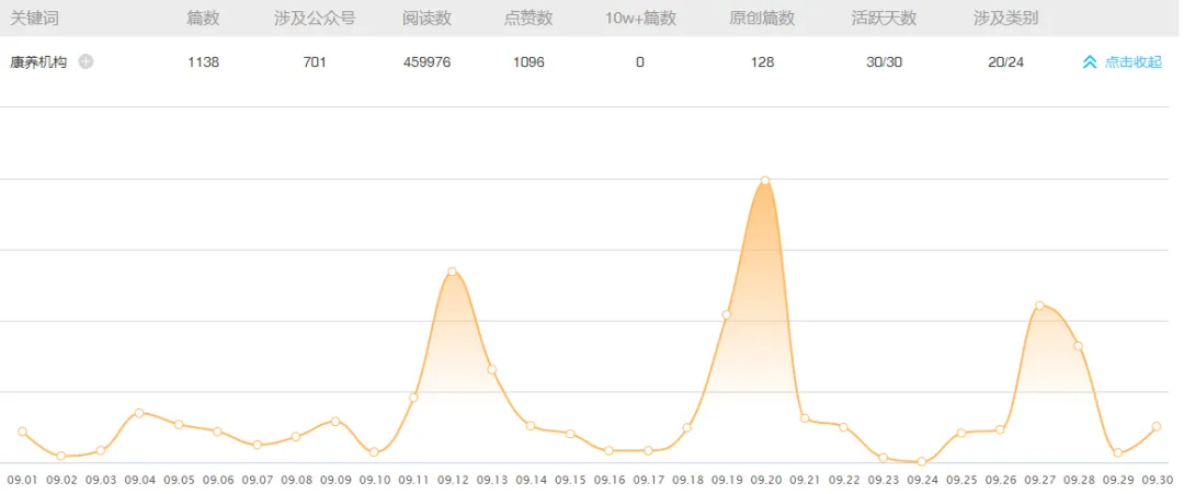 图中为每日“康养机构”关键词涉及公众号文章的总阅读数趋势
