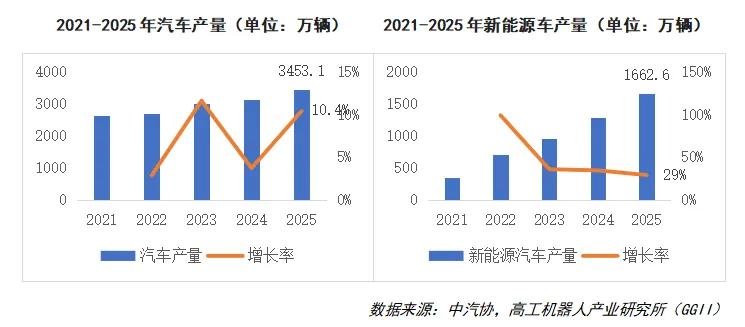 新能源汽车方面,2025年新能源汽车产销量分别达到1662.6万辆和1649万辆,同比分别增长29%和28.2%。新能源汽车的快速发展带动上游汽车零部件厂商的自动化投资热潮,推动协作机器人加速落地应用;另一方面,新能源汽车的快速迭代,对汽车产线的柔性生产能力提出了更高要求,协作机器人凭借柔性部署、人机协同、快速切换的优势,完美匹配新能源汽车柔性生产的需求。比亚迪、吉利、奇瑞等头部汽车批量导入协作机器人产品,树立了显著的行业示范效应。
