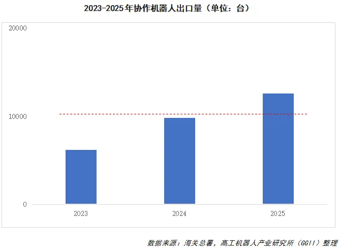 海外市场的开拓,使得国产协作机器人厂商摆脱国内单一市场的局限,实现海内外市场双轮驱动的发展格局。从出口量看,根据海关总署数据,2023-2025年,国内协作机器人出口量逐年上升,2025年协作机器人出口突破万台大关。