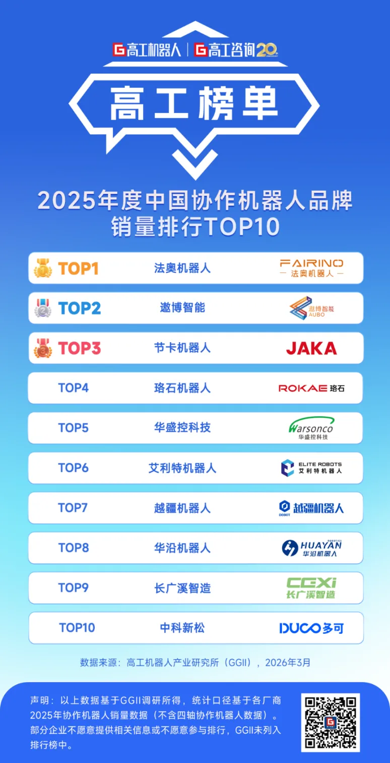 GGII通过对各家协作机器人品牌的调研,发布《2025年度中国协作机器人品牌销量排行TOP10》。
