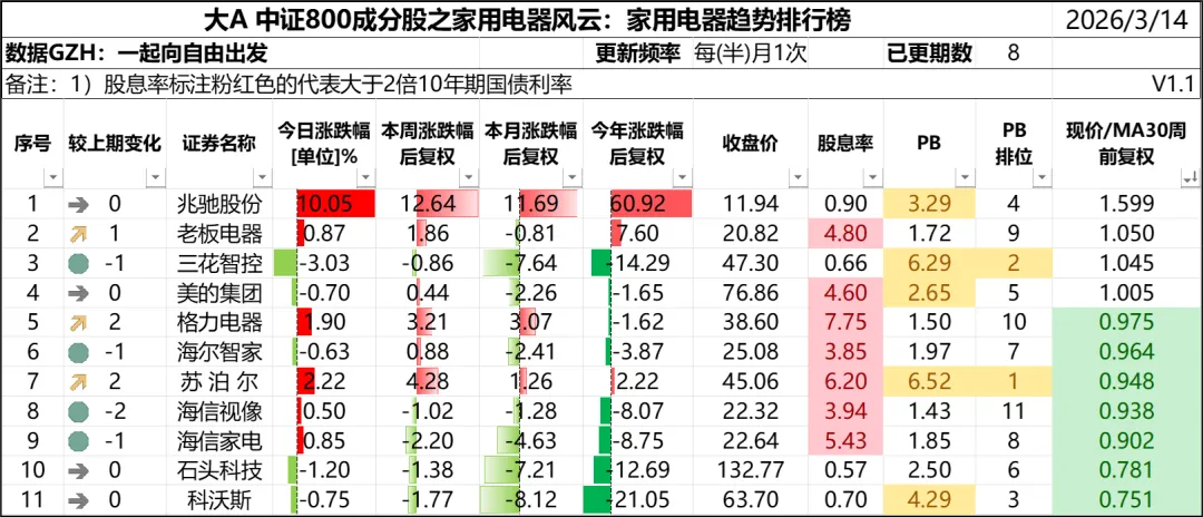 001、2025年11月4日家用电器趋势排行榜栏目正式上线。发布时12家属于中证800指数成分股。第4期时只有11家处于中证800成分股,四川长虹、飞科电器被踢出中证800成分股,苏泊尔被调入中证800成分股。