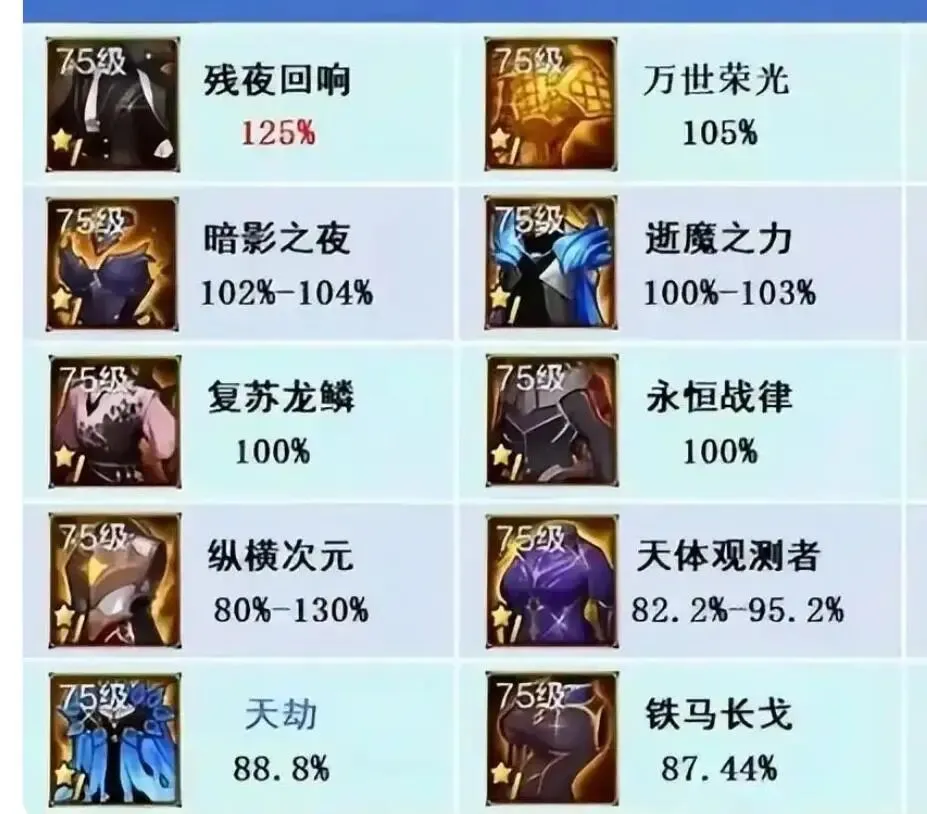 ⑦狂战士暗狱魔刹85071%加上帝魔焚天52530%,红眼永远有饭吃,新套装铁马长戈还能再战一波,平民玩家首选。