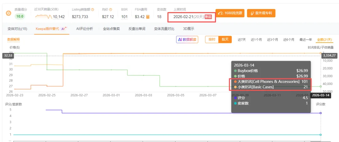 反查新品ASIN的ABA排名,可以看到他在2月底刚上架时,还未被任何词收录的情况下,品牌相关词就已经自带了流量