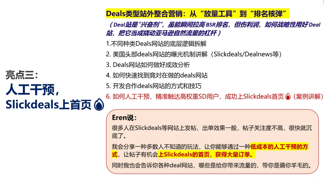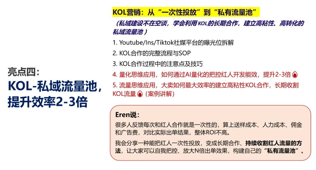 l成功降低广告成本、提升能效的整合营销策略,从内容产出、到红人合作、到广告投放,一系列打法,高效整合资源,达成“品效合一”闭环,放大效果的方法(同样的营销渠道和预算,其他卖家或许ROI=1-2,但老师讲解的方法ROI 能达到4-8,是其他人的4 倍)
