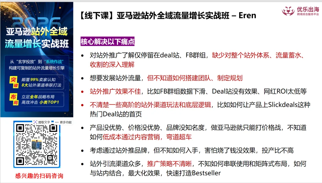 Eren老师在这场课程中会带来站外0-1品牌建设SOP,帮助卖家品牌营销起步