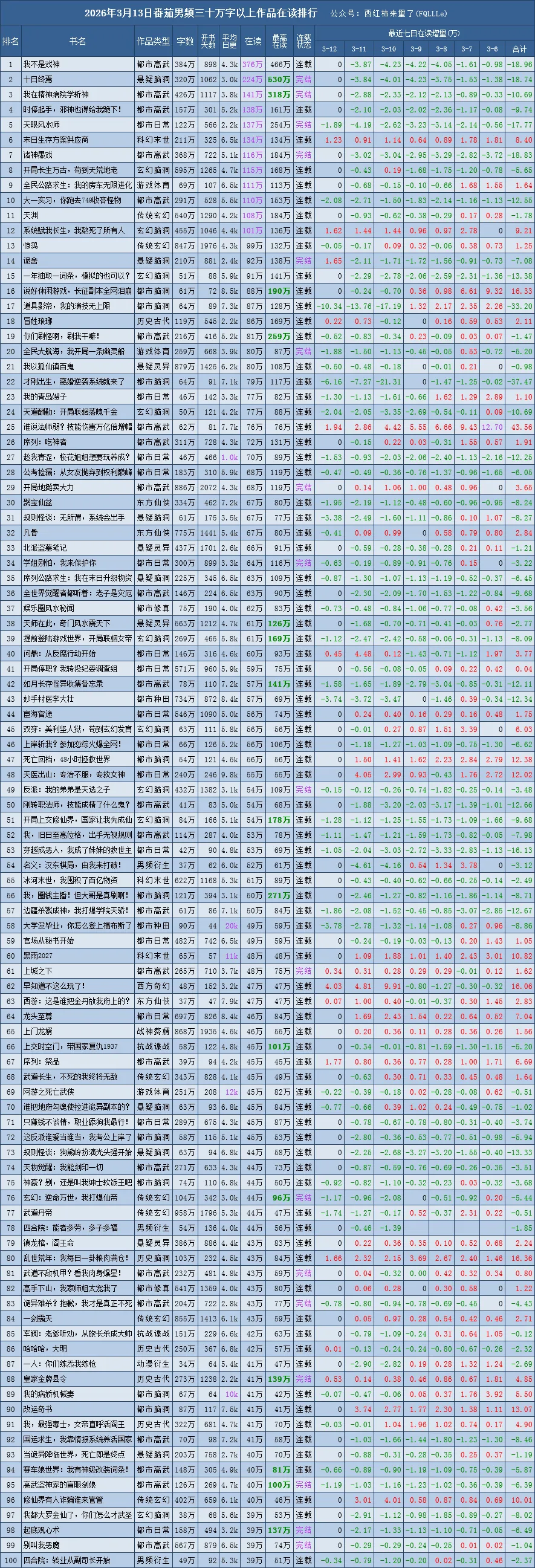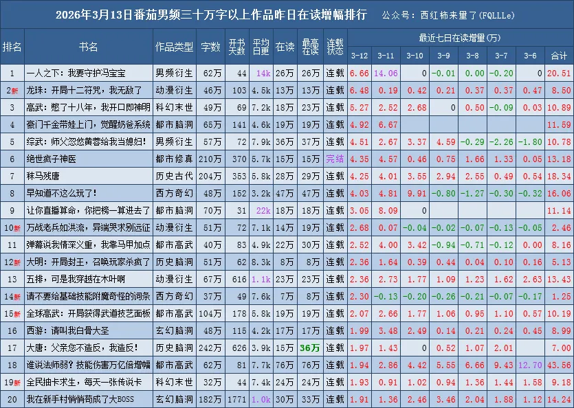 红色新字表示该作品首日进入该榜单top20