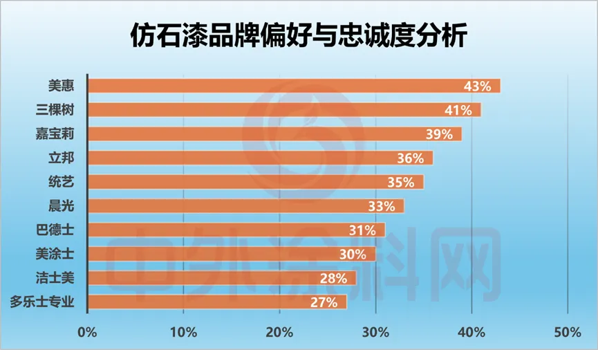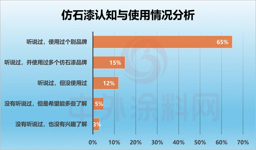 根据中外涂料网调查显示,仿石漆在目标受众中的渗透率极高,累计知晓率达到97%(含听说过但未使用者)。其中,65%的受访者表示“听说过并使用过个别品牌”,这表明大部分消费者已完成从“认知”到“体验”的转化,但品牌忠诚度或对比度尚待培养,多数用户仍停留在单品牌尝试阶段。