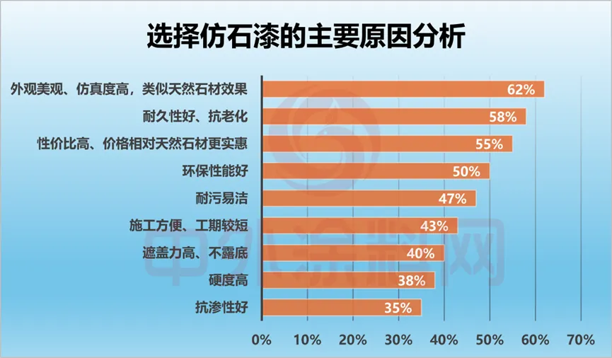 在本次中外涂料网针对仿石漆消费决策动因的专项调研中,“外观美观、仿真度高,类似天然石材效果”以62%的占比位居首位,成为用户选择品牌的首要考量。紧随其后的是“耐久性好、抗老化”(58%)与“性价比高、价格相对天然石材更实惠”(55%),表明消费者在追求视觉品质的同时,也高度关注产品的长期价值与经济回报。