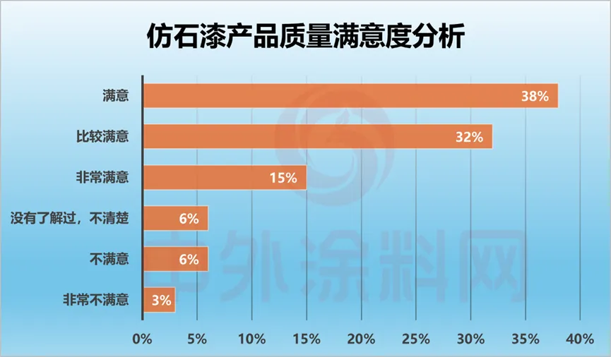 中外涂料网统计结果表明,受访者对仿石漆产品的整体质量评价呈现“正面为主,理性审慎”的分布特征。其中,表示“满意”的用户占比最高,达到38%,显示出主流产品的基本性能已能较好地满足市场需求;紧随其后的是“比较满意”群体,占比32%,这部分用户虽认可产品大方向,但在耐污性、色彩持久度或施工适配性等细节上仍存有细微顾虑,认为产品有优化空间。给予“非常满意”评价的用户占比15%,表明仅有少数实现了“产品+施工”完美匹配的项目能获得用户的极致认可。
