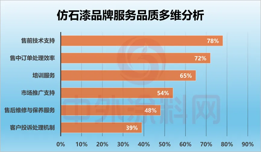 从调研结果来看,仿石漆品牌服务的核心竞争点高度集中在“售前技术支持”(78%)与“售中订单效率”(72%),这两项构成了用户感知的“硬底座”,直接决定了项目的落地可行性。紧随其后的是“培训服务”(65%),反映出行业对“三分料、七分工”的共识,用户极度看重品牌对施工端的专业赋能。相比之下,“市场推广支持”(54%)与“售后维保”(48%)虽属重要加分项,但在决策优先级上略逊于直接关乎交付的技术与物流环节,而“投诉处理机制”(39%)提及率最低,暗示了该环节在用户日常体验中的“隐性”特征或品牌响应的透明度不足。