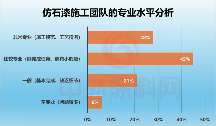 数据表明,虽然近七成(73%)的施工团队具备基本交付能力,但真正能达到“工艺精湛”标准的不足三成。在仿石漆“三分料、七分工”的行业铁律下,施工团队的专业度直接决定了最终效果的成败。品牌方与业主在合作中,应建立更严格的施工准入与验收标准,通过专业化培训与标准化监理,推动那45%的“中间力量”向“非常专业”梯队跃升,同时坚决淘汰尾部不合格产能,以保障仿石漆工程的长期品质与口碑。
