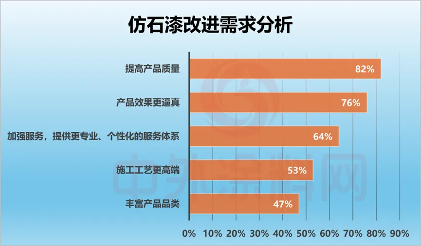 在仿石漆改进需求方面,中外涂料网调研数据清晰地勾勒出仿石漆市场改进需求的优先级。“提高产品质量”(82%)与“产品效果更逼真”(76%)以绝对优势占据榜首,这表明用户的核心痛点依然聚焦于产品的耐用性与装饰性的极致平衡,市场正从“有得用”向“用得久、像真石”的高标准跃迁。紧随其后的是“加强服务,提供更专业、个性化的服务体系”(64%),反映出随着产品同质化加剧,单纯的材料销售已无法满足需求,用户迫切渴望获得涵盖方案设计、色彩定制及施工指导的全链路增值服务。相比之下,“施工工艺更高端”(53%)与“丰富产品品类”(47%)虽然提及率稍低,但作为差异化竞争的关键补充,它们共同构成了用户对品牌综合实力的深层期待。