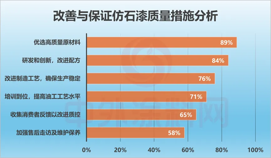 在改善与保证仿石漆质量措施分析方面,“优选高质量原材料”(89%)与“研发创新,改进配方”(84%)被公认为质量控制的源头核心,表明行业共识已高度统一——优质的基因必须始于材料筛选与配方迭代,这是决定产品耐候性与仿真度的先天基础。紧随其后的是“改进制造工艺,确保生产稳定”(76%),这凸显了从实验室配方到规模化生产中,标准化制造对于消除批次差异、保证品质一致性的关键作用。这三项合计构成了质量保障的“铁三角”,占据了受访者关注度的绝对主导,说明在硬实力层面,源头把控与技术沉淀是解决质量问题的根本途径。