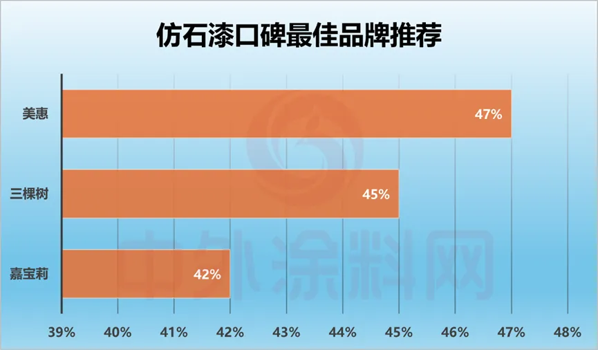 根据受访者对各品牌产品质量和服务品质的综合评价,推荐三个仿石漆口碑最佳品牌分别为美惠、三棵树和嘉宝莉。具体数据显示,美惠以47%的口碑指数位居前列,三棵树(45%)与嘉宝莉(42%)紧随其后。这三项数据的高位集中,客观反映了当前市场在品牌选择上的高度共识:用户倾向于将信任赋予那些在质量稳定性与服务响应速度上表现更为均衡的头部企业。这种分布并非偶然,而是消费者在经历了大量市场筛选后,对品牌综合交付能力做出的理性投票。