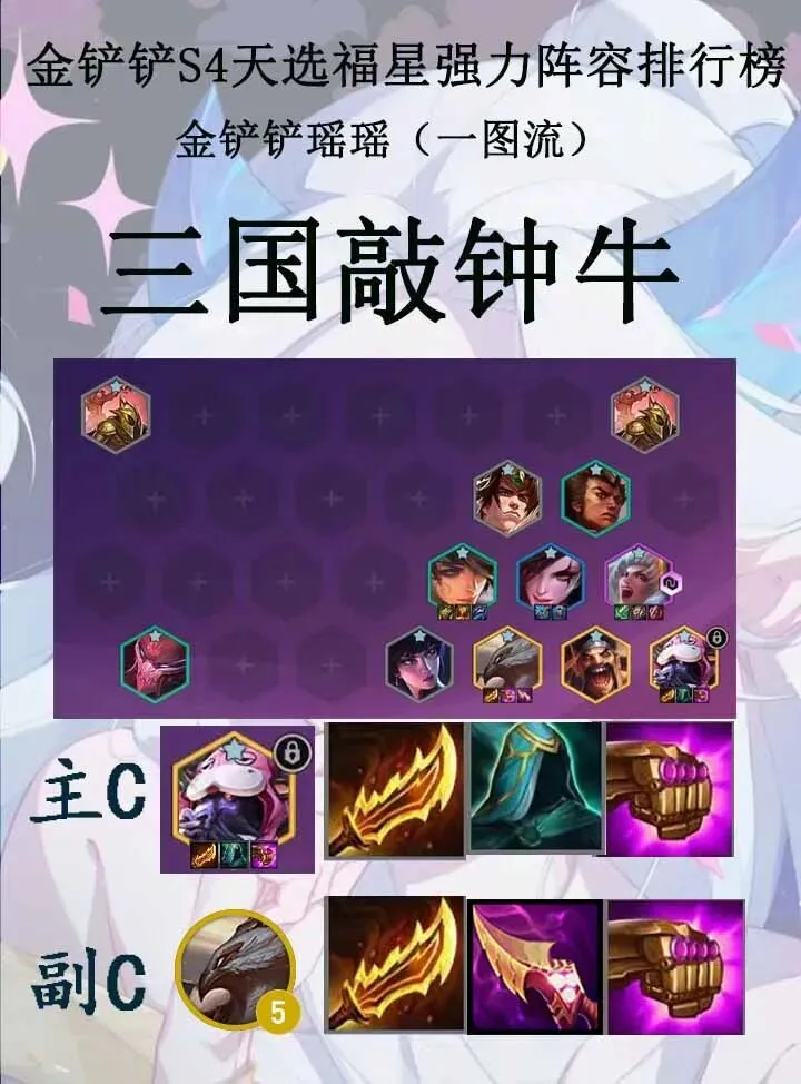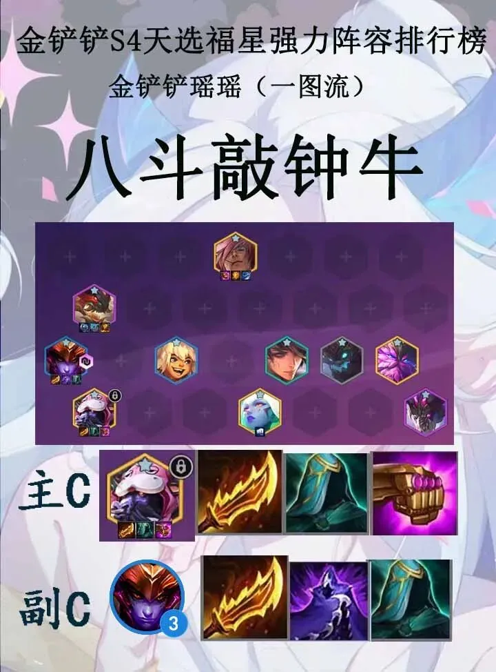 三国敲钟牛在牛头被砍后,强度有所下降,同时解锁牛头刚需狂徒,后期上限没有八斗敲钟牛上限高,但是强度依旧在线,八级八三国猛将二斗士或者五三国猛将四斗士给上蔚肉装直接解锁牛头,后期给牛头围起来依然能打