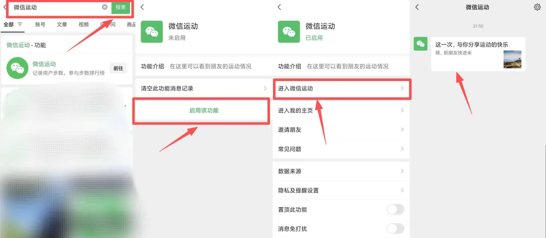 大家好,我是科技手册,每天和大家分享好玩有趣的玩机技巧。现在越来越多的人重视身体健康的重要性了,好多人都戴着苹果手表或者华为手环再或者小米手表,除了记录测量心率之外还可以同步日常运动步数,同步到微信的话还可以参加运动排行,一举两得。那么微信运动步数这个功能怎么打开,如何打开微信步数排行榜,微信运动恢复正常计步,下面跟着小编操作轻松搞定,同时祝你早日暴富,当然可别忘了顺便点个赞支持一下,也不枉小编熬夜写攻略~1、如图1所示,打开微信进入聊天页面,点击右上角的“放大镜”进入搜索界面输入“微信运动”2、然后点击微信运动右侧的“前往”按钮,之后点击启用该功能即可进入微信运动界面3、再微信运动公众号页面之后,点击页面下方的步数排行榜即可查看当前步数排名。如何捐赠步数
