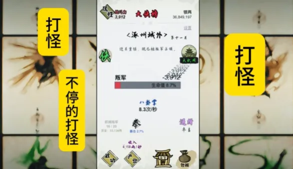 上线收收银两,升级解锁各类武学秘籍,从八卦刀法到绝世掌法,慢慢集齐整本秘籍的成就感直接拉满。摸鱼的时候挂在后台,完全不耽误事,轻轻松松就能圆你的江湖大侠梦。