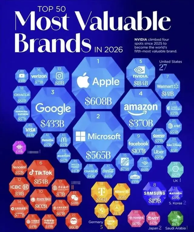 话说回来,12个品牌进全球50强,这个成绩已经够硬气了。全球品牌价值的牌桌上,现在基本就中美两家在玩,其他国家的品牌要么数量少,要么排名靠后,存在感越来越弱。