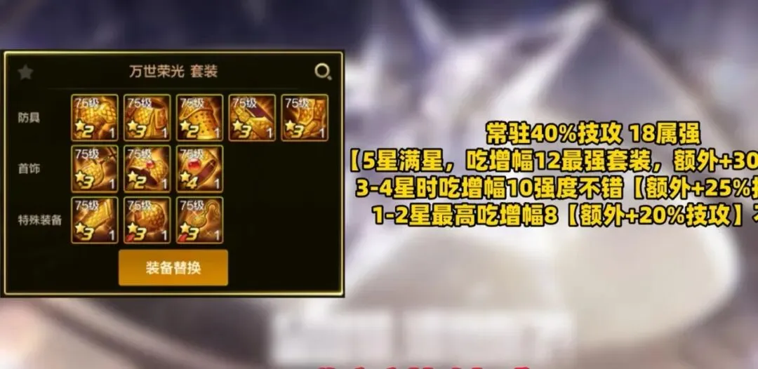 ①万世荣光套装常驻40%技攻加18属强,满星增幅12额外再送30%技攻,全身红12玩家首选,稳定高伤不翻车。