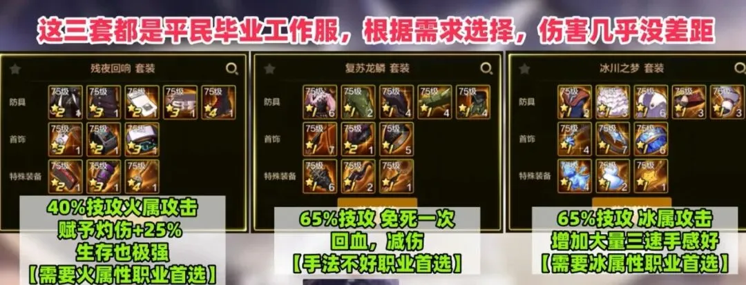 ②工作装三套伤害差距极小,火职业选残夜,冰职业选冰川,手残选复苏,按需抄作业。