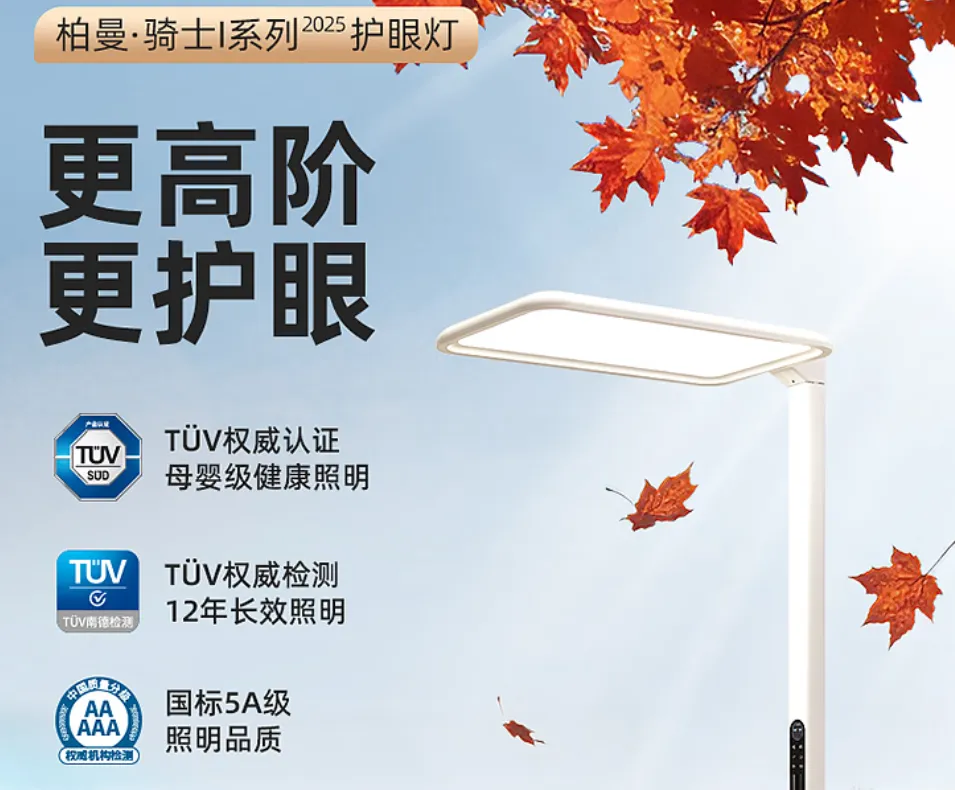 这款灯是国内高性价大路灯的代表,在保持较低售价的同时,其参数表现、光源技术等整体品质水平丝毫不逊色于其他高端大路灯产品。漫书雨星光Pro桌面平均照度1600Lx,色温4000K,Ra>98、R9>98,蓝光RG0豁免危害,数字调光真正0频闪,无眩光。在光源技术方面,这款灯应用普瑞原装进口灯珠,寿命轻松突破55000小时,搭配自然光全光谱技术,大量削减有害蓝光,充分补足益眼红光与天青光提升视网膜细胞活 力、化 解睫状肌疲劳。3.柏曼骑士IPro