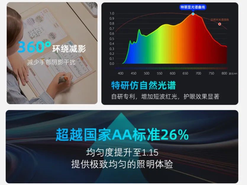 优童P6Max采用恒定4000K色温,贴合儿童用眼需求;显色指数Ra>98,达到博物馆级别;蓝光符合并优于RG0安全等级,眩光值UGR<13,无可视频闪,规避用眼风险。采用美国普瑞原装进口灯珠,搭配700nm红光增益光源,可独立控制红光哺光,同时搭载全光谱技术,削减有害蓝光、补充有益天青光。
