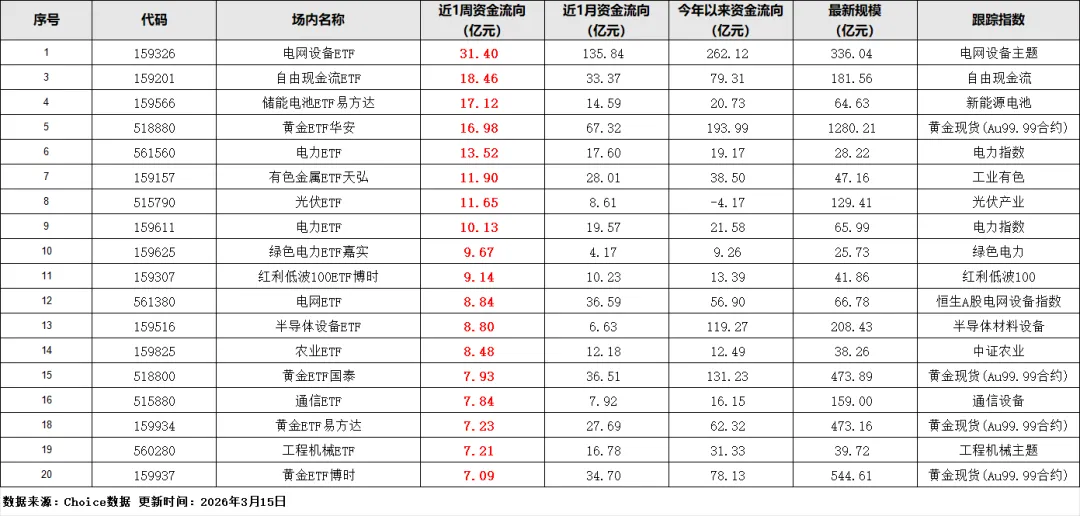 净流入榜单里,电网设备ETF(159326)一骑绝尘,单周净流入31.40亿元,不管是近1月135.84亿元的净流入,还是今年以来262.12亿元的规模,都能看出资金对电网设备这条线的坚定看好。紧随其后的黄金、储能、电力相关ETF也都在净流入,黄金ETF华安(518880)单周进了16.98亿元,今年以来规模已经冲到1280.21亿元,妥妥的资金"避风港";自由现金流ETF(159201)、光伏、有色金属这些赛道也都有不错的净流入,能看出来资金偏爱有业绩支撑、属于高景气细分的方向。