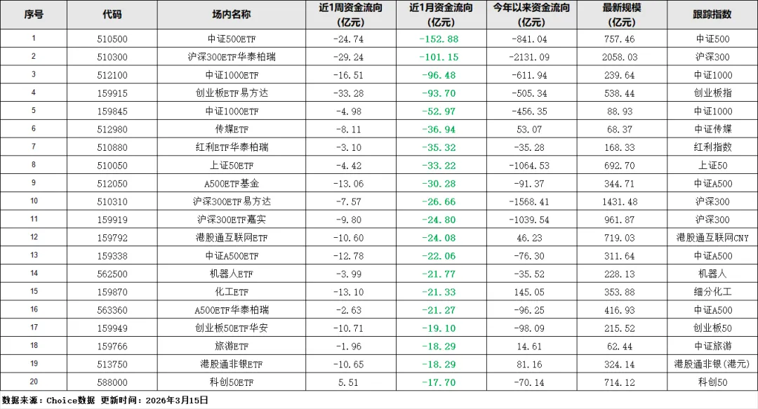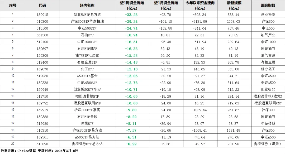 再看流出端,创业板ETF易方达(159915)单周净流出33.28亿元,沪深300ETF华泰柏瑞(510300)流出29.24亿元,中证500ETF(510500)、中证1000ETF(512100)也都在大幅减持。这里面的逻辑很简单:宽基指数覆盖的是全市场核心标的,资金从宽基撤离,一方面是觉得宽基的弹性不够,另一方面是把资金集中到了更有结构性机会的细分赛道,毕竟当下市场不是普涨行情,结构性机会才是重点。