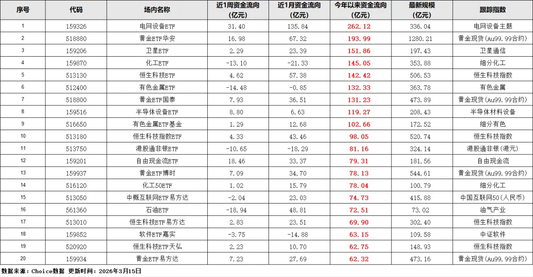 净流入榜单的前几名,全是电网、黄金、卫星、化工、半导体这些赛道。电网设备ETF(159326)今年以来净流入262.12亿元,黄金ETF华安(518880)流入193.99亿元、卫星ETF(159206)流入151.86亿元,化工ETF(159780)流入145.05亿元,这些赛道的今年以来净流入规模都突破了百亿,资金的布局意图非常明确——押注高景气、有政策支撑的细分方向。