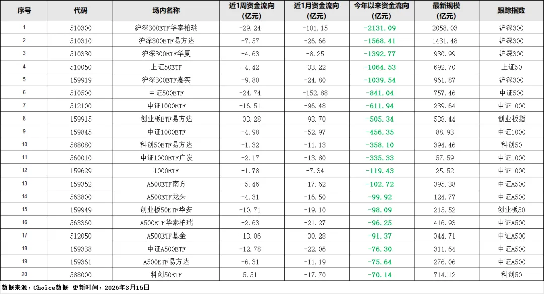 而宽基指数这边,沪深300ETF华泰柏瑞今年以来净流出2131.09亿元,沪深300ETF易方达流出1568.41亿元,中证500ETF流出841.04亿元,创业板ETF易方达流出505.34亿元,单只宽基ETF的年度净流出规模都在几百亿甚至上千亿,这背后是资金对"泛科技+能源"赛道的持续偏爱,同时也说明资金觉得宽基的短期性价比不如细分赛道。