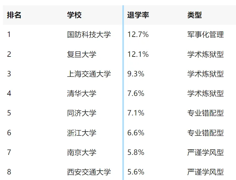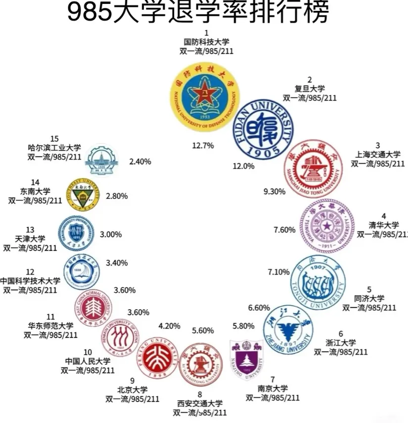 二舅转发了一条链接,标题刺眼:《985大学退学率排行榜曝光:国防科大12.7%居首,清华7.6%超想象》。