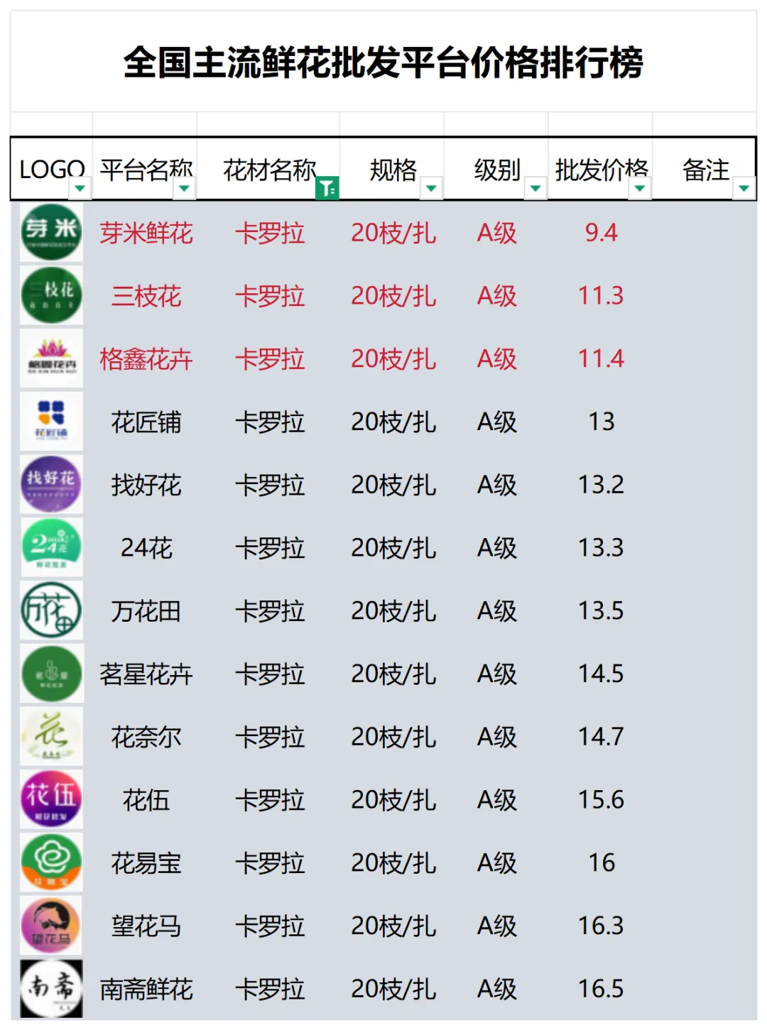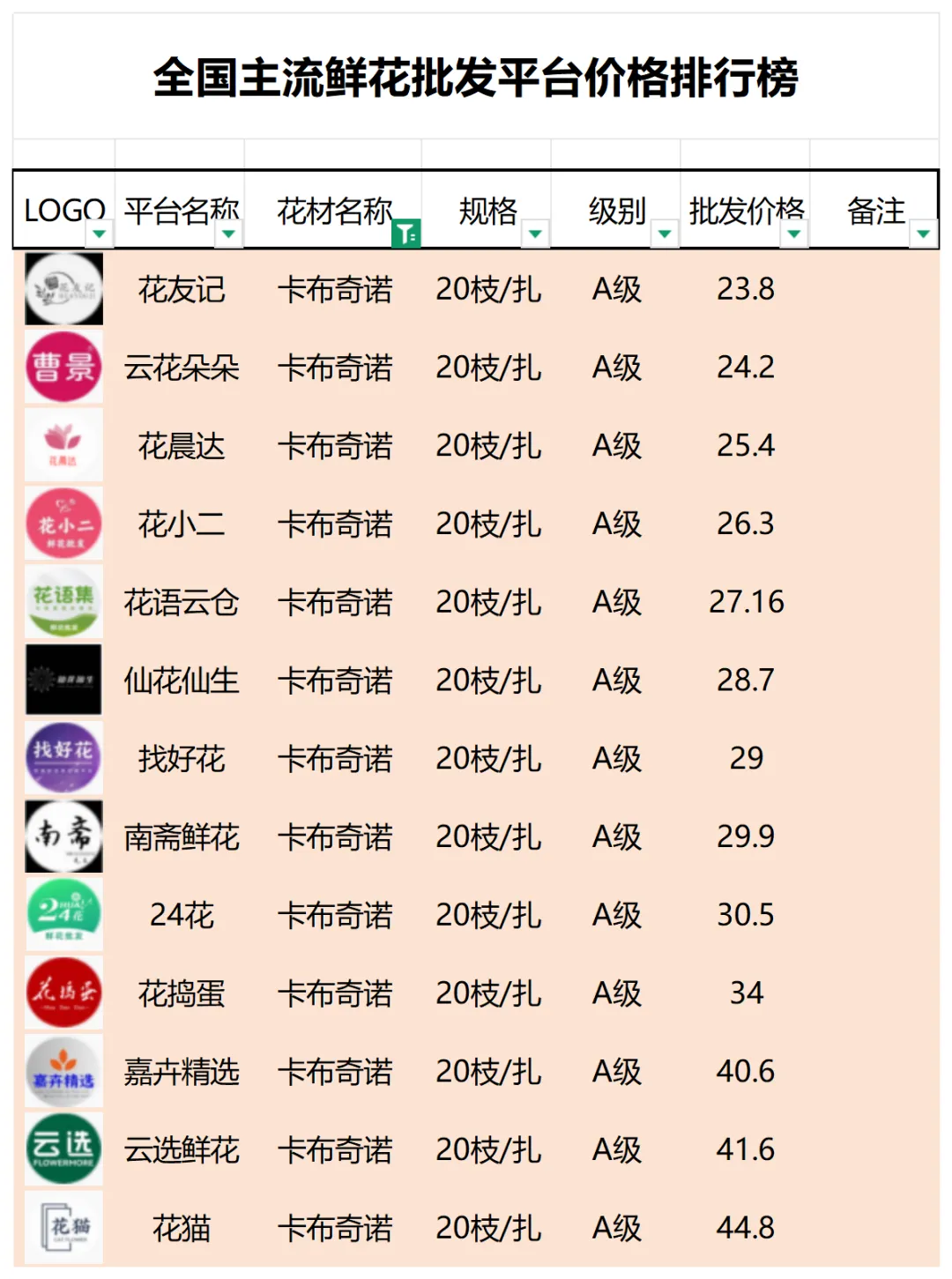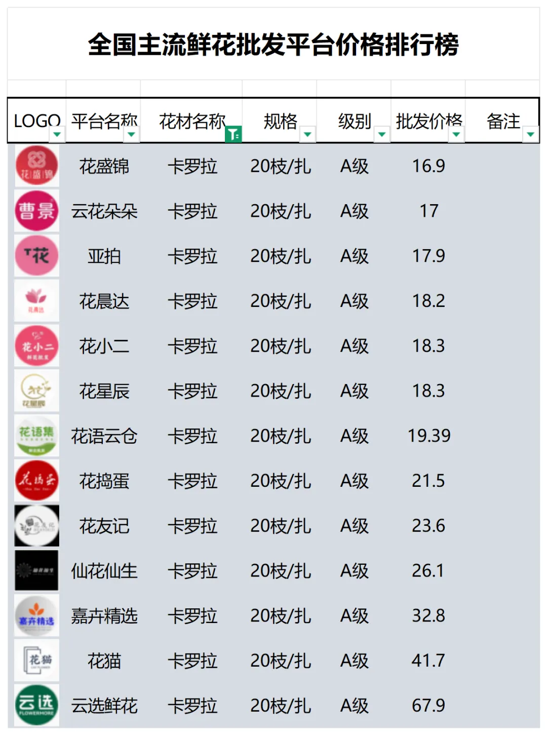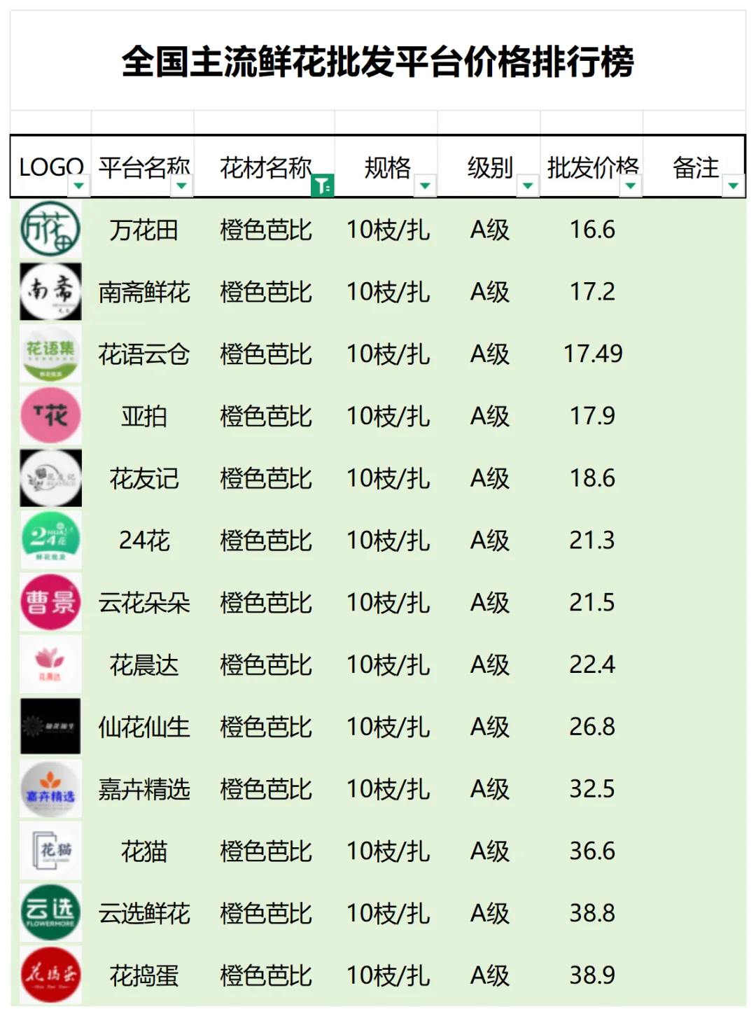 2、本数据只收录A级花材批发价格,覆盖全国大部分主流鲜花批发平台