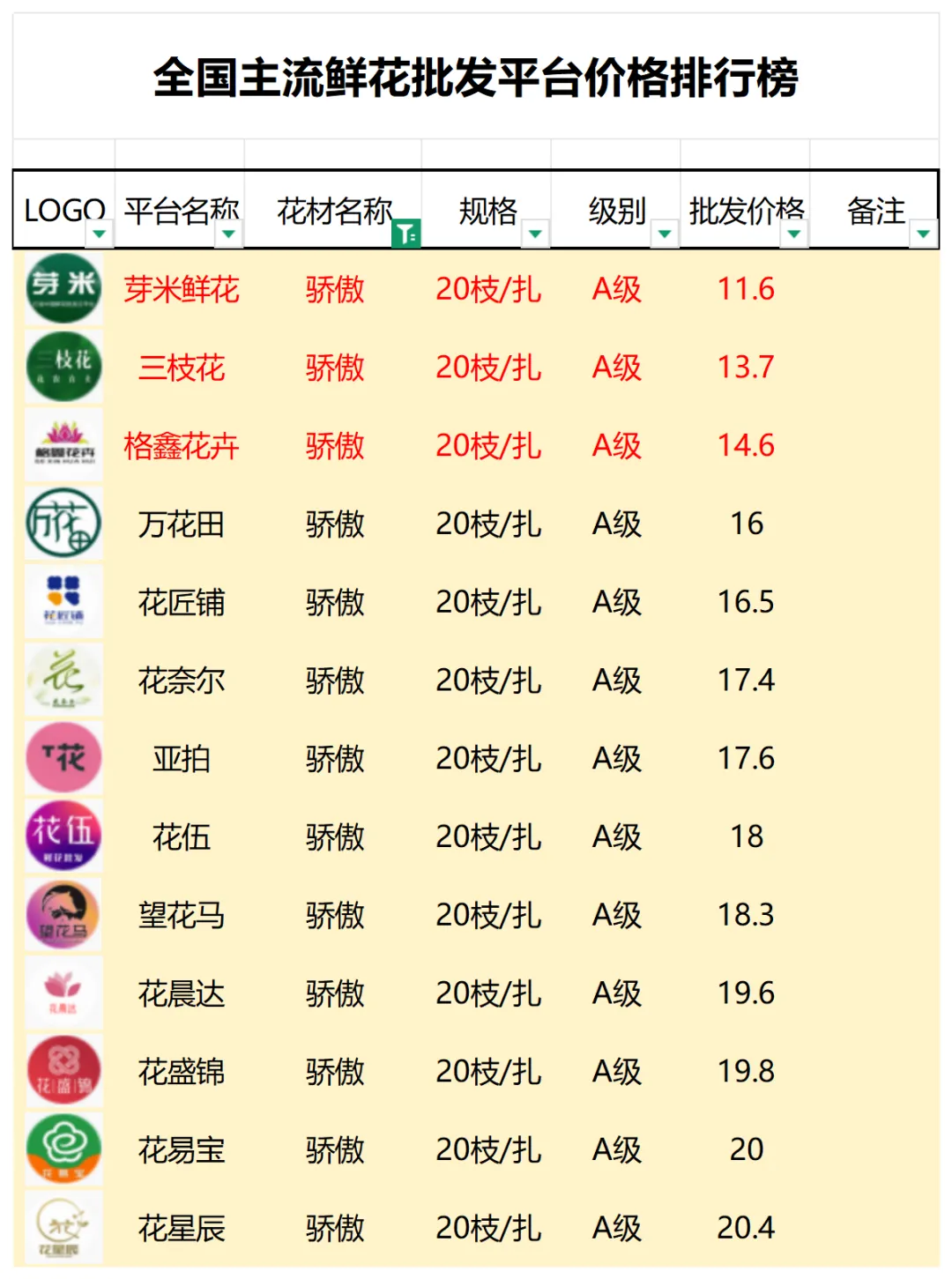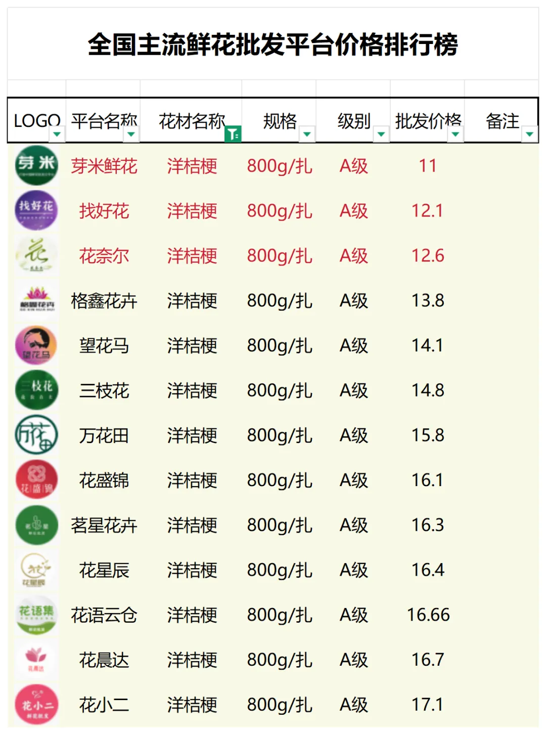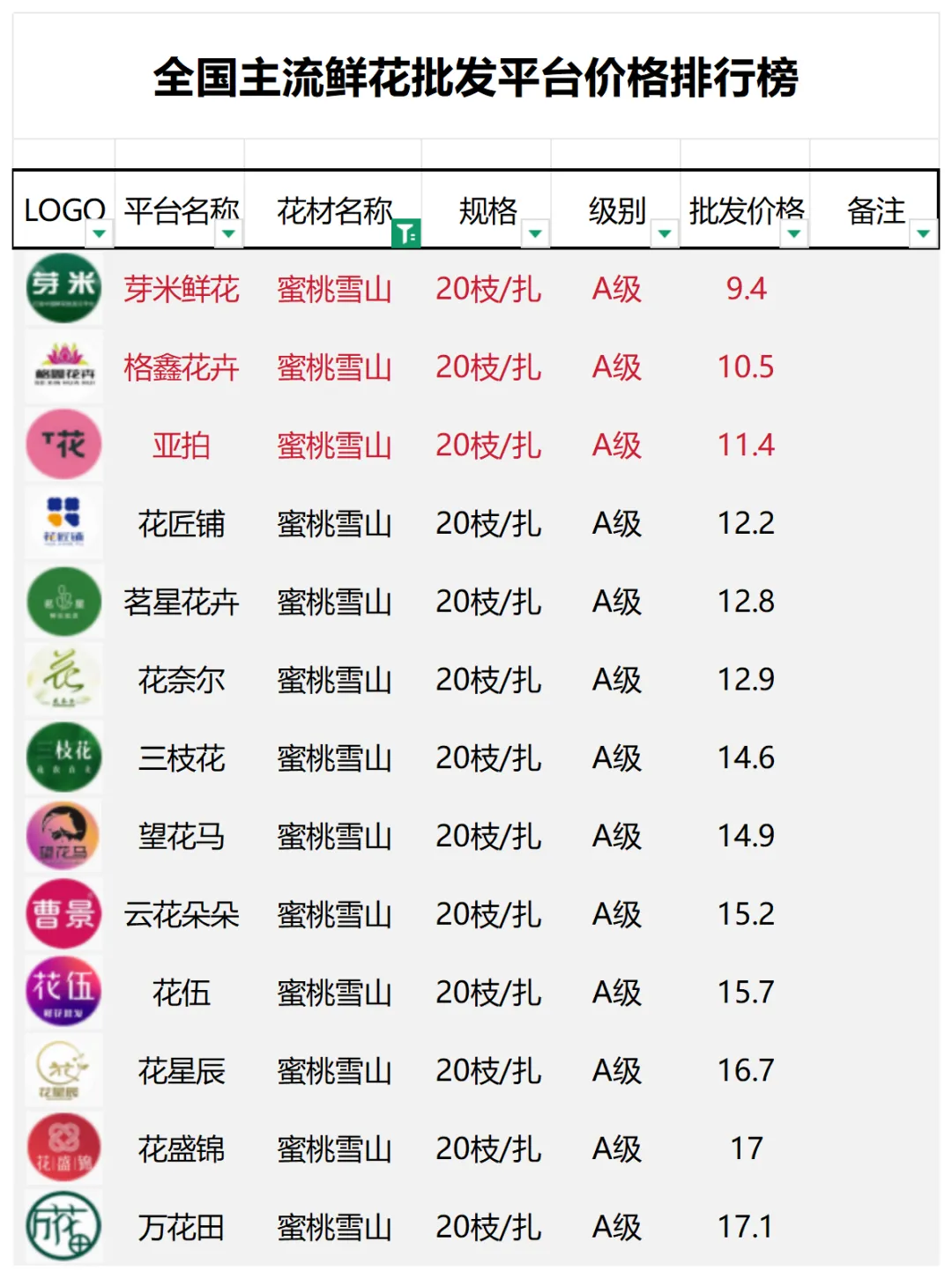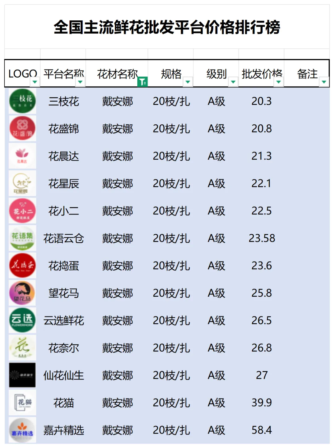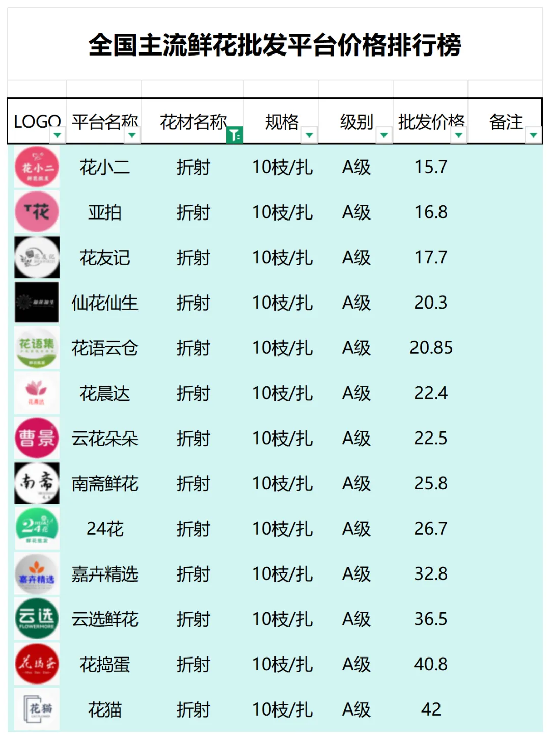 2、本数据只收录A级花材批发价格,覆盖全国大部分主流鲜花批发平台