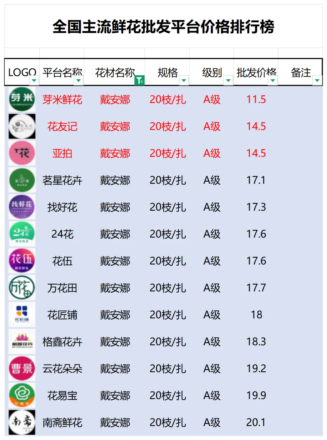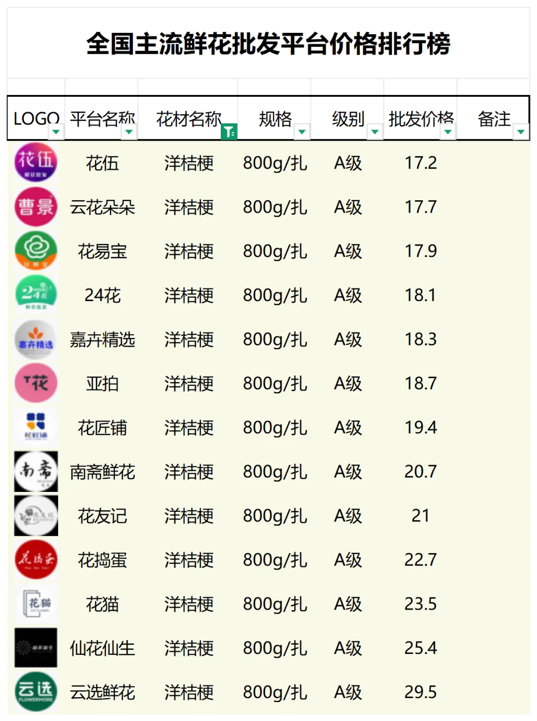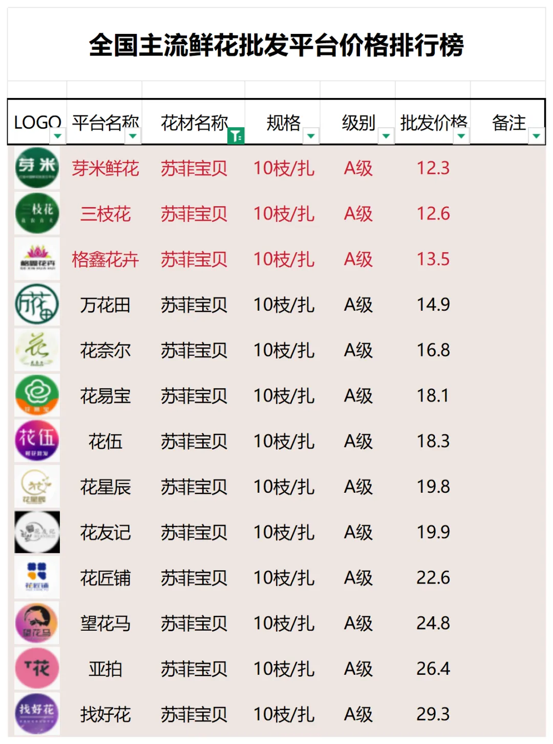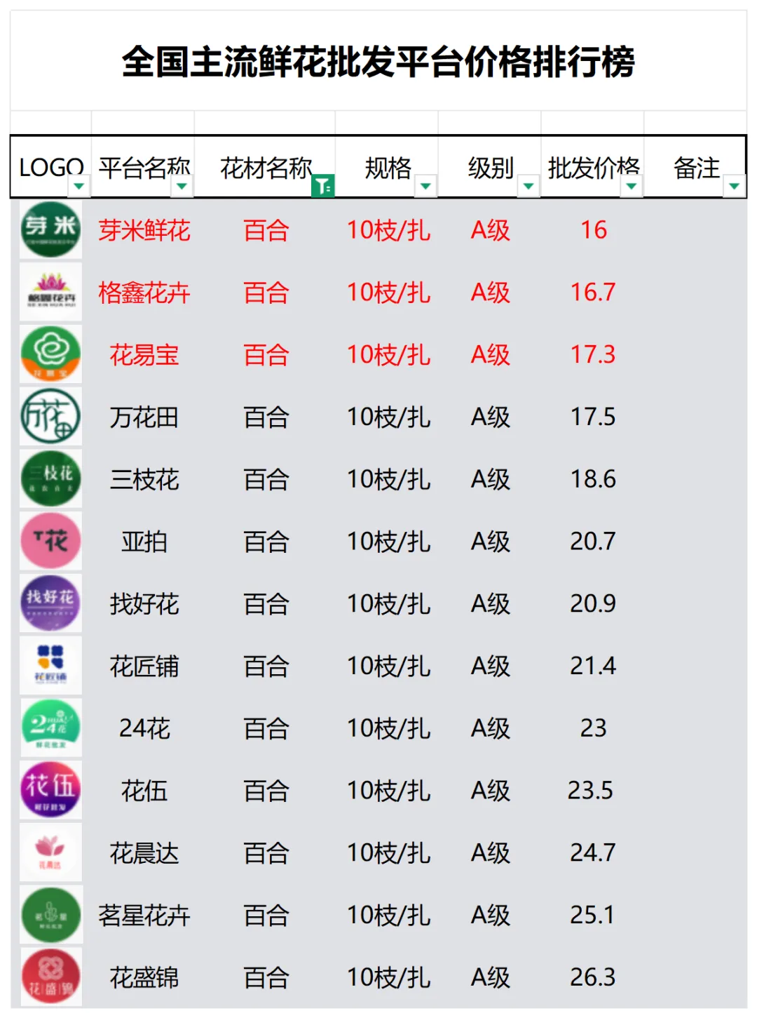 2、本数据只收录A级花材批发价格,覆盖全国大部分主流鲜花批发平台